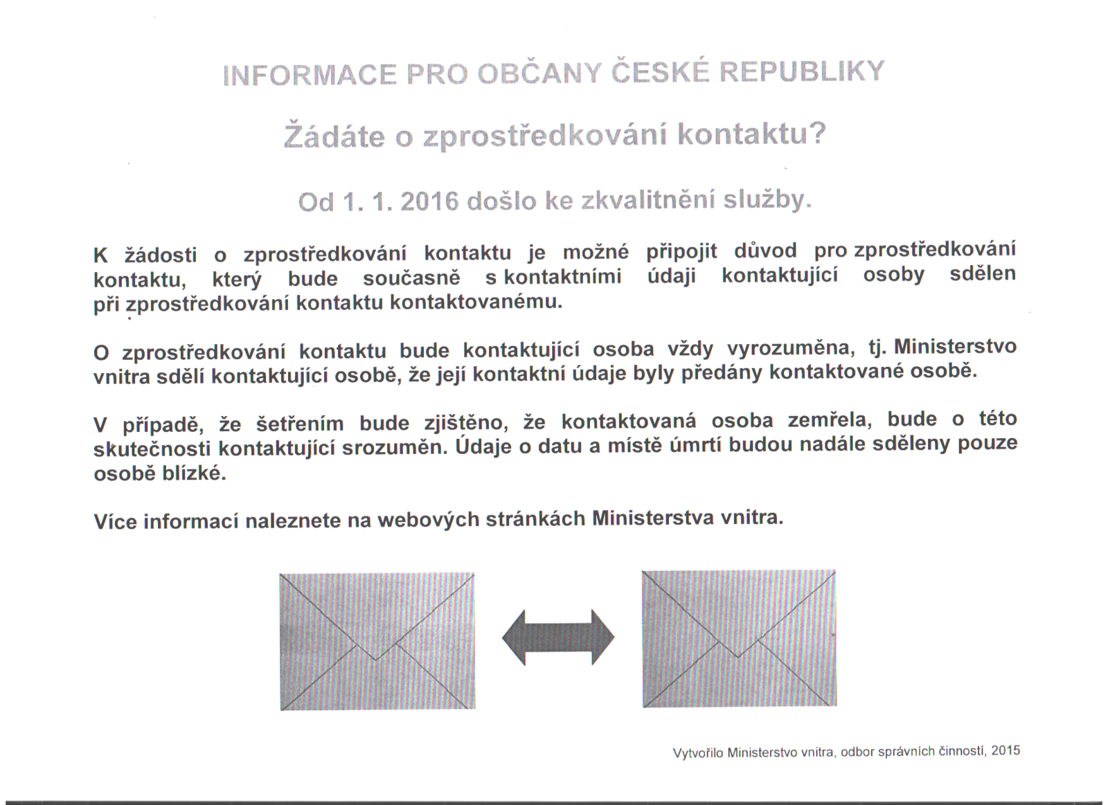 O zprostředkování kontaktu bude kontaktující osoba vždy vyrozuměna, tj. Ministerstvo vnitra sdělí kontaktující osobě, že její kontaktní údaje byly předány kontaktované osobě.